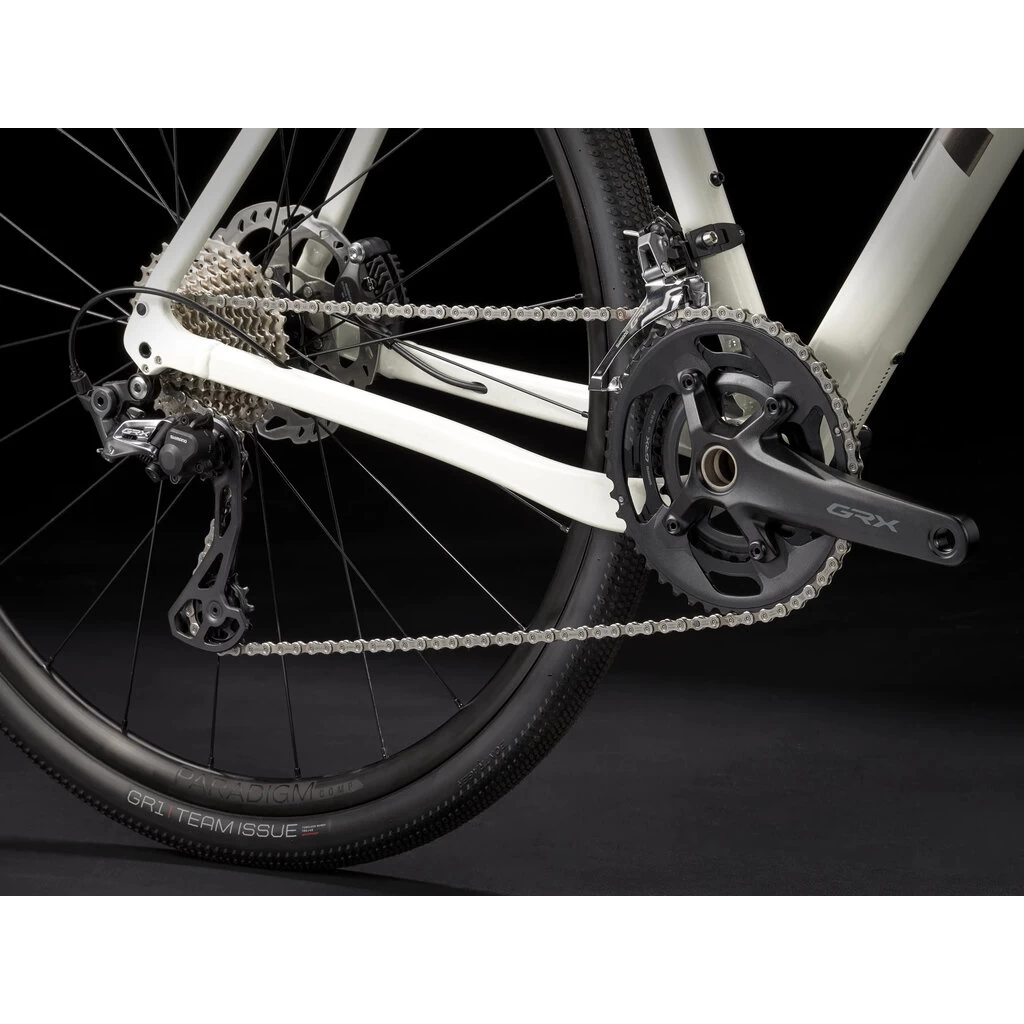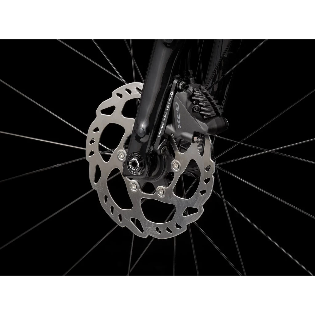 A sturdy aluminium frame with a progressive geometry that’s stable at speed and efficient when you’re grinding up a climb, hidden cables that won’t interfere with bags, rack and mudguard mounts and integrated frame bag mounts, a 2×11 Shimano GRX drivetrain with lower gears for grinding up hills or through rough gravel, hydraulic disc brakes for all-condition stopping power, tubeless-ready rims and wide 700x40c gravel tyres for added stability and traction.